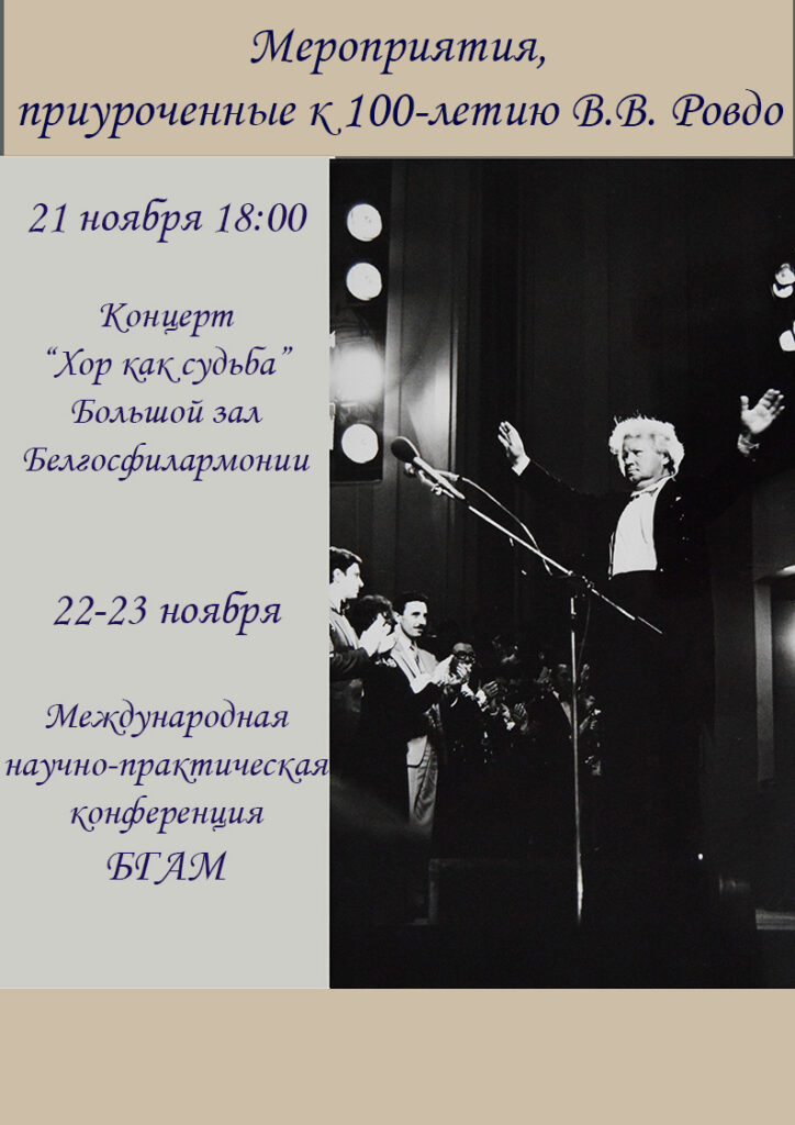 22-23 ноября 2021 г. Белорусская государственная академия музыки проводит Международную научно-практическую конференцию к 100-летию со дня рождения Народного артиста СССР, профессора В.В.Ровдо «Хоровое искусство в мировом музыкальном пространстве».