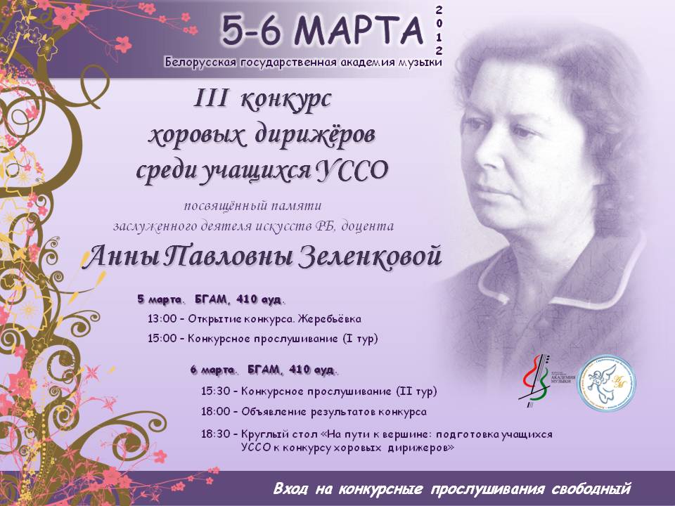 Третий конкурс хоровых дирижёров среди учащихся УССО посвященный памяти А.П.Зеленковой окончен, и мы с удовольствием объявляем Вам результаты:
