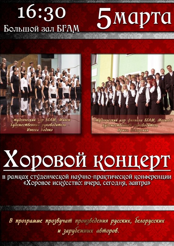 В рамках студенческой научно-практической конференции “Хоровое искусство: вчера, сегодня, затвра” 5 марта в 16:30 в большом зале главного корпуса Белорусской государственной академии музыки состоится концерт Студенческого хора БГАМ и Студенческого хора могилевского филиала БГАМ.