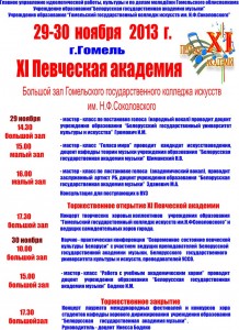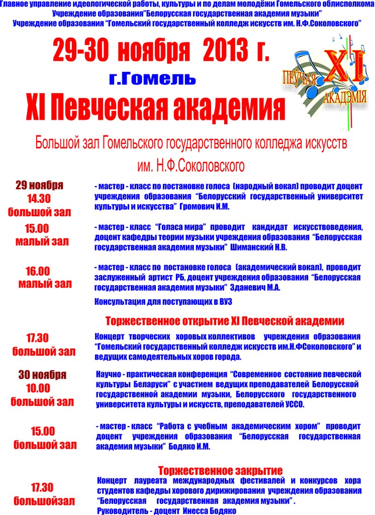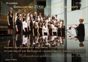 30 ноября на торжественном закрытии XI Певческой академии, которое состоится в 17.30 в Большом зале ГГКИ им. Н.Ф. Соколовского состоится концерт лауреата международных фестивалей и конкурсов хора студентов кафедры хорового дирижирования учреждения образования