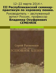 Семинар предназначен для практикующих хормейстеров республики (руководителей любительских, детских, юношеских хоров, хоров учебных заведений), преподавателей и учащихся учреждений среднего специального и высшего образования. В этом году он посвящён работе над выдающимся произведением мировой хоровой классики – “Всенощным бдением” С.В. Рахманинова.