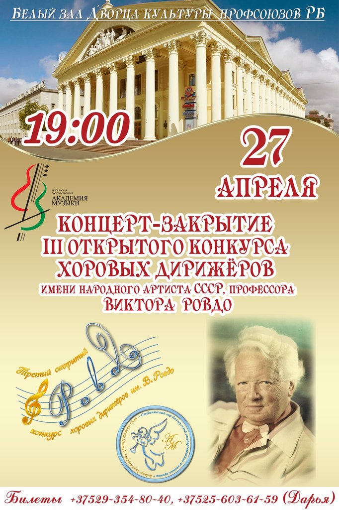 Приглашаем ВСЕХ ВСЕХ ВСЕХ на торжественное мероприятие!!! В программе: выступления финалистов III открытого конкурса хоровых дирижеров им. В.В. Ровдо со студенческим хором Беларусской государственной академии музыки и ВРУЧЕНИЕ НАГРАД! Это уникальная возможность увидеть на одной сцене в качестве дирижеров студентов БГАМ, а также наших коллег из России, Украины, Литвы!