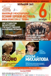6 октября в 19.00, в Большом зале Московской консерватории им. П.И.Чайковского, белорусское хоровое искусство будет представлено выступлениями следующих коллективов: