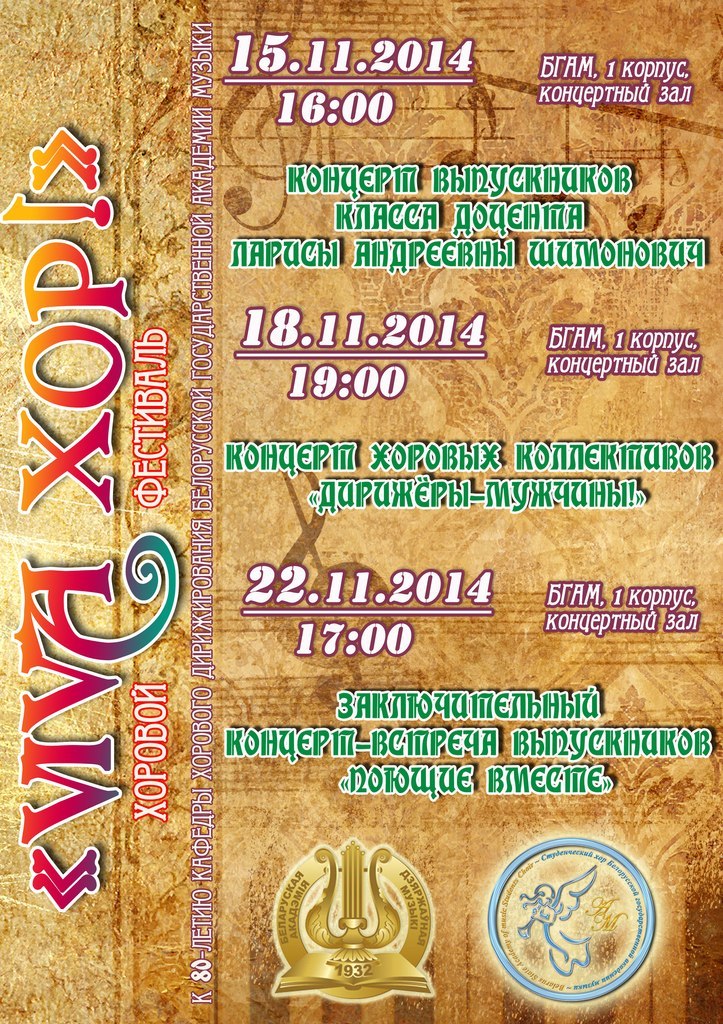 В 2014 году кафедра хорового дирижирования Белорусской государственной академии музыки празднует 80-летие со дня основания. В течение года в рамках празднования юбилея наша кафедра проводила многочисленные мероприятия, среди которых: Третий открытый конкурс хоровых дирижеров им.В.Ровдо, мастер-классы мастеров хорового искусства, концерты. И наконец, финальным аккордом заключительных торжеств в ноябре 2014 года станет… хоровой фестиваль «Viva хор!».