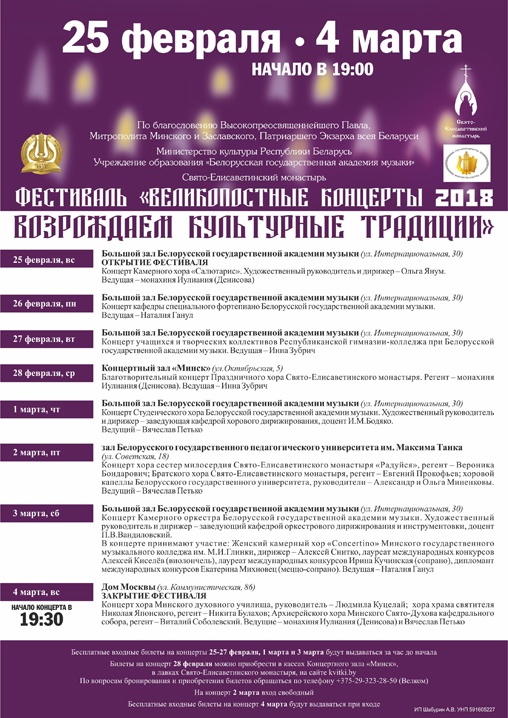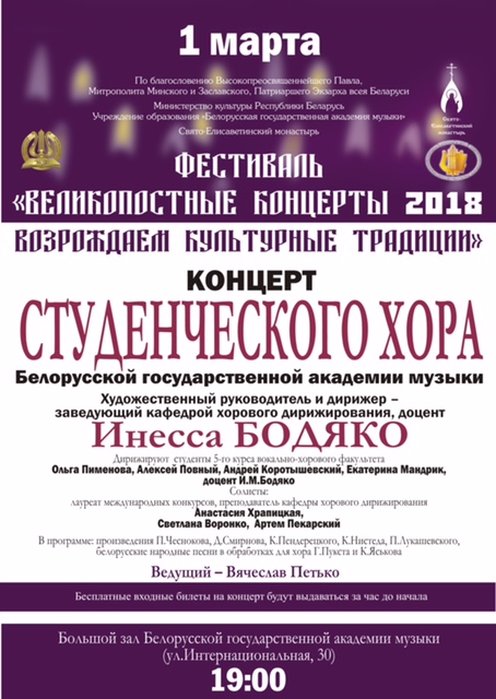 В период с 25 февраля по 4 марта 2018 года по благословению Высокопреосвященнейшего Павла, Митрополита Минского и Заславского, Патриаршего Экзарха всея Беларуси Белорусская государственная академия музыки совместно со Свято-Елисаветинским монастырем проводит уникальный творческий проект – фестиваль “Великопостные концерты-2018: возрождаем культурные традиции”.