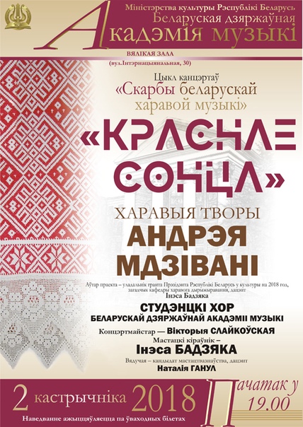 2 кастрычника 2018 года, 19.00. Вялiкая зала (вул. Інтэрнацыянальная, 30). Канцэрт з цыкла “Скарбы беларускай харавой музыкi”. “Краснае сонца”. Харавыя творы Андрэя Мдзiванi.