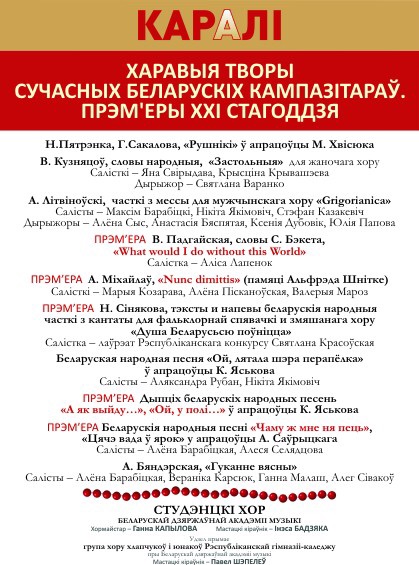 В исполнении хора Белорусской Государственной академии музыки прозвучат произведения и обработки белорусских народных песен маститых, молодых и начинающих белорусских композиторов и хоровых дирижеров ХХ – ХХI века: В.Кузнецова, Н. Хвисюка, А. Литвиновского, А.Бендерской, А.Саврицкого.