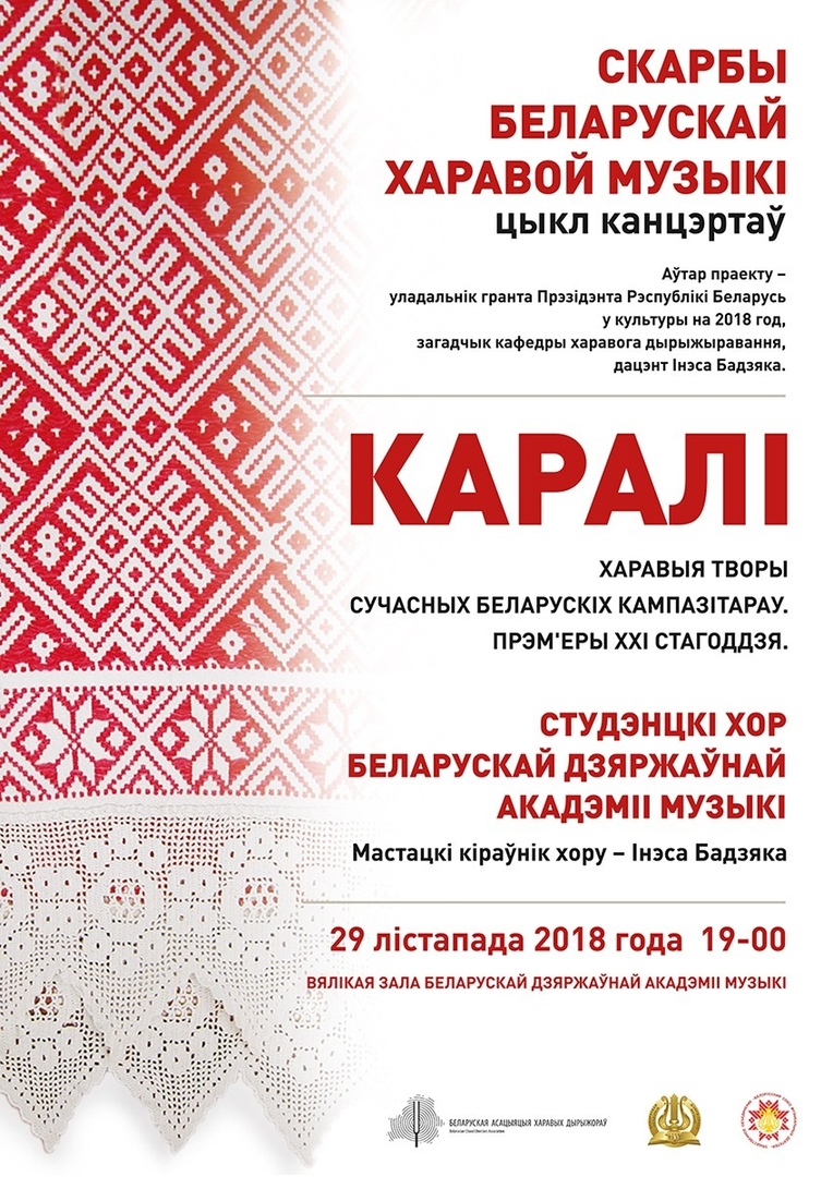 Хоровой концерт «Каралi» организован в рамках проекта «Скарбы беларускай харавой музыкi». Автор проекта – обладатель гранта Президента Республики Беларусь в области культуры на 2018 год, заведующий кафедрой хорового дирижирования, доцент Инесса Бодяко.