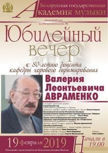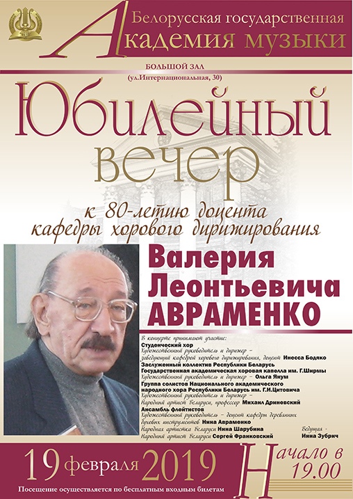 Мы рады пригласить вас 19 февраля 2019 года, 19.00 в Большой зал Белорусской академии музыки (ул. Интернациональная, 30) на юбилейный концерт доцента кафедры хорового дирижирования Валерия Леонтьевича Авраменко!!!