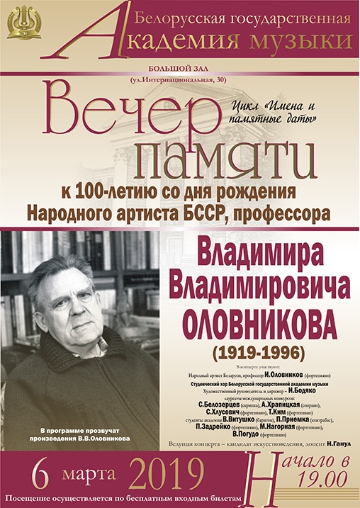 6 марта 2019 года в 19.00, в большом зале Белорусской государственной академии музыки (ул. Интернациональная, 30) прошёл концерт к 100-летию со дня рождения Народного артиста БССР, профессора В.В.Оловникова, цикл «Имена и памятные даты».